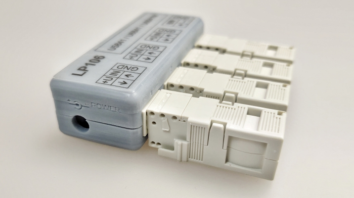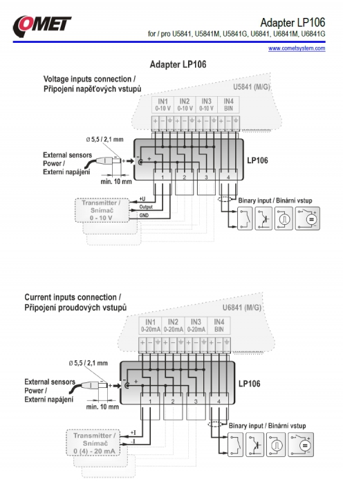 Sorkapcsos bekötésű csatlakozó (aljzat) adapter bemeneti jelek könnyű csatlakoztatására. Védettsége IP20. Az adapter lehetővé teszi a csatlakoztatott távadók tápellátását, pl. AC/DC hálózati adapterről.