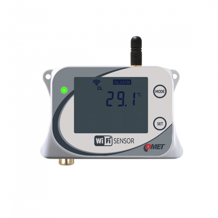 Communication with the sensor is done via a wireless WiFi network. The device allows sending measured values to the online COMET Cloud or COMET Database storage with the shortest interval of 5 minutes. The values can be displayed on integrated web pages and provided to third party systems using the Modbus TCP protocol. The measured values are displayed on the LCD display.